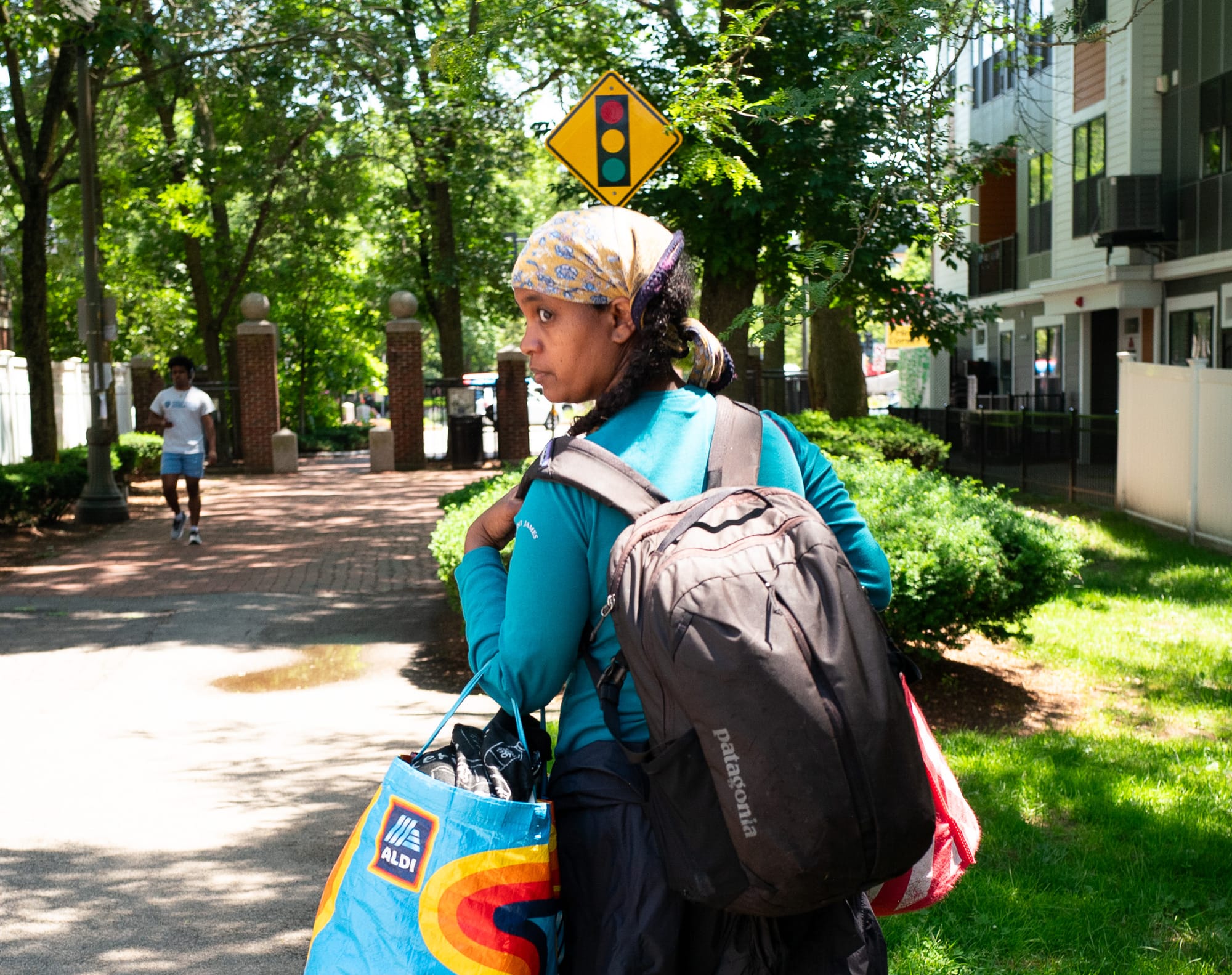 I’d worked out before this walk, ending with a sauna and cold plunge. I think this routine helps make the heat manageable for the walk—the sun and the natural motion of the body warming it back to equilibrium. There was an odd interruption in the walk: a bright orange garbage truck snorting down the path. The truck took all of us on the path by surprise. Here is one such person.