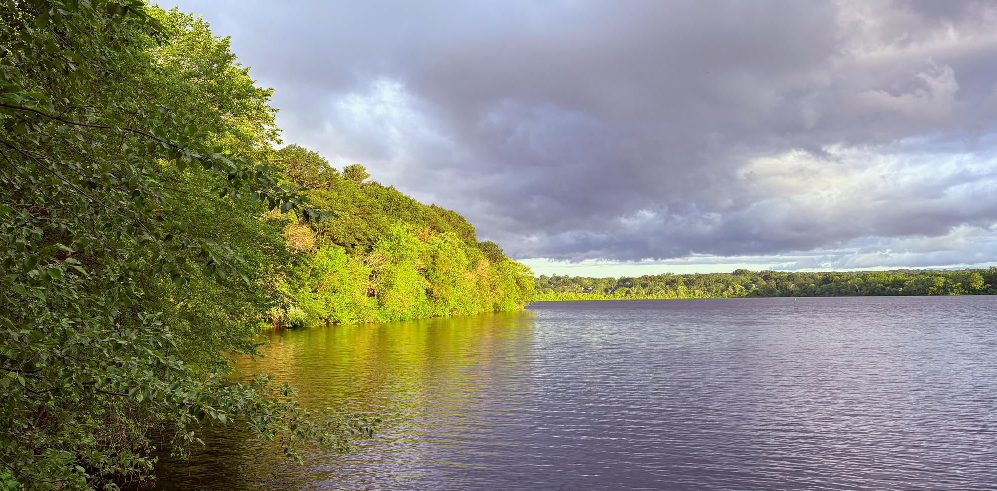 I’m walking around Fresh Pond this morning. As I entered the path, the sprinklers popped up in the parking lot and caught a young man sitting on the curb off guard. He leapt up, laughing—just one of those unexpected moments that breaks up the day. The light is strange and beautiful: bright green summer leaves glowing in early sunshine, while dark clouds linger from last night’s windy storm. Cinematic. I’ll try to capture it.